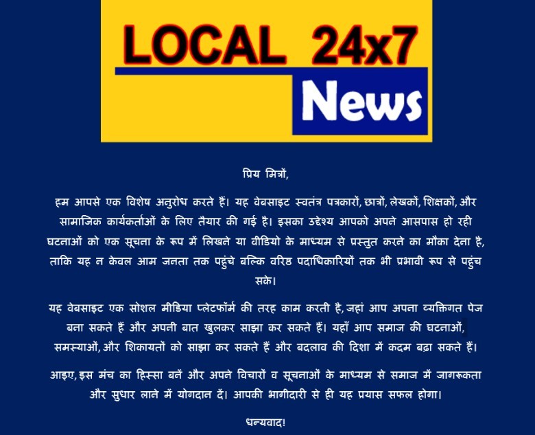 हम आपसे एक विशेष अनुरोध करते हैं। यह वेबसाइट स्वतंत्र पत्रकारों, छात्रों, लेखकों, शिक्षकों, और सामाजिक कार्यकर्ताओं के लिए तैयार की गई है। इसका उद्देश्य आपको अपने आसपास हो रही घटनाओं को एक सूचना के रूप में लिखने या वीडियो के माध्यम से प्रस्तुत करने का मौका देना है, ताकि यह न केवल आम जनता तक पहुंचे बल्कि वरिष्ठ पदाधिकारियों तक भी प्रभावी रूप से पहुंच सके।